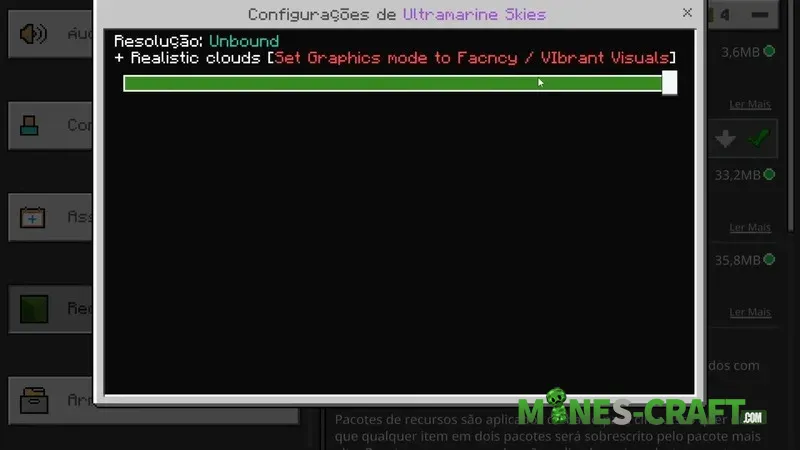 The Ultramarine Client features a flexible enviroment configuration where you can choose between cubic and realistic clouds, as well as adjust color saturation and night fog density.