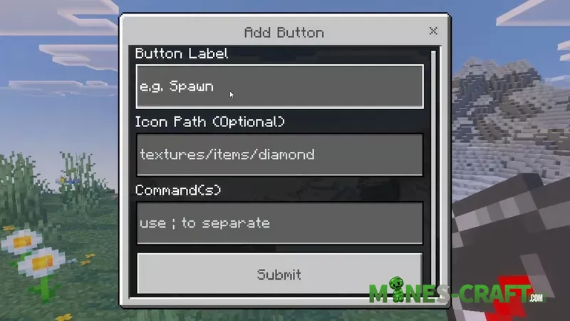 The process of creating a button is incredibly simple: you set the Label, you can select an optional Icon Path (for example, textures/items/diamond), and most importantly, you write the Command(s) that will be executed when the button is pressed.