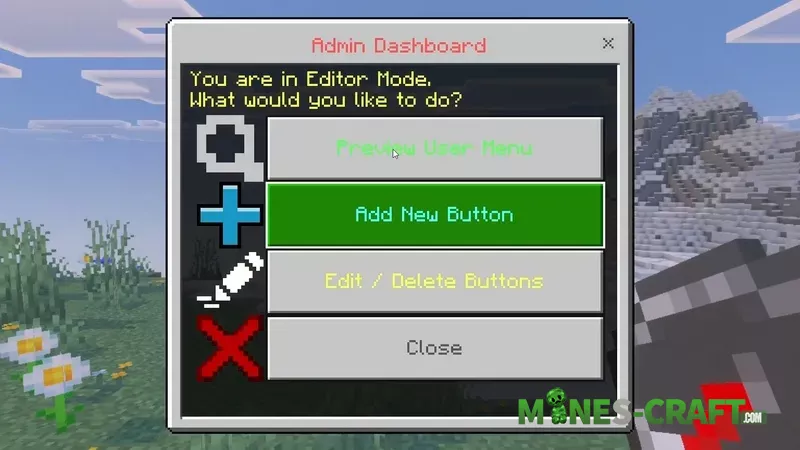 The main strength of this add-on lies in its built-in visual editor, and to access the editor’s control panel, you only need to have the admin tag (/tag @s add admin). Hold down the compass and right-click/long-press to access the Admin Dashboard, where you can select:
