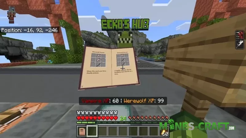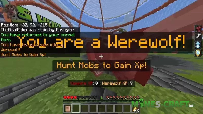 After installation, you will recieve a guide (“menu”) and vampire XP and werewolf XP will be displayed above the quick access panel. To gain experience you need to kill mobs, starting with simple animals, like chickens, and moving on to stronger creatures like horses