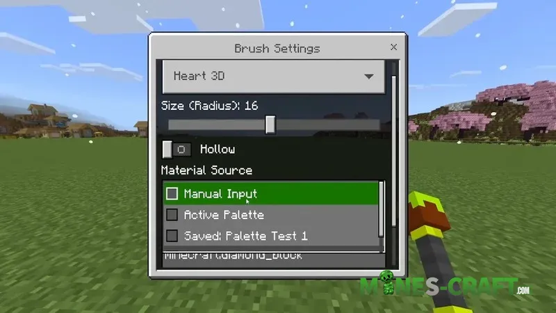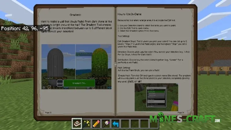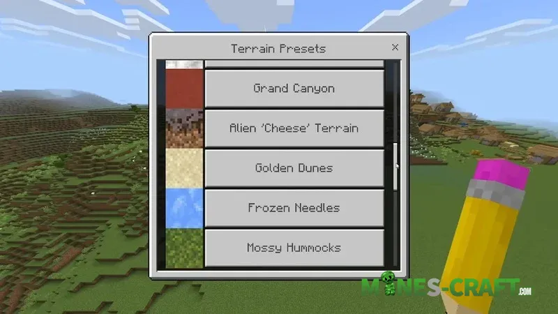 You can create your own terrain by specifying base and surface blocks, or use custom combinations. Presets such as jagged peaks, lava ridge, and void lands allow you to quickly generate structures. A palette system for grouping blocks into sets and using them together. Gradients for creating smooth transitions between blocks, but they require practise for precise tuning.