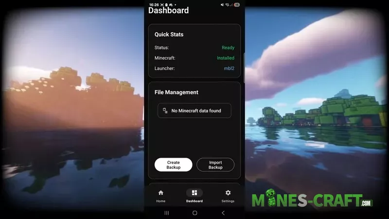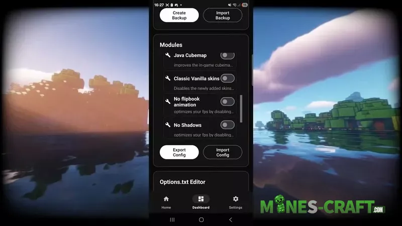 Through the Dashboard tab, you can enable or disable visual and technical options: remove fog, turn off particles, activate Fullbright, or disable shadows. The app also supports editing the options.txt file, viewing logs, and creating your own themes.